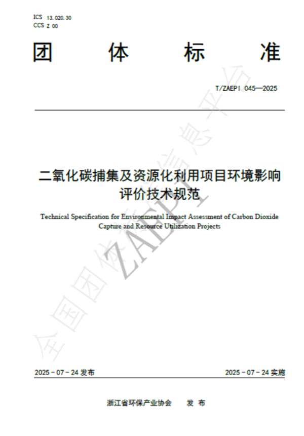 2025年7月24日,由浙江省環(huán)保集團(tuán)生態(tài)環(huán)保研究院牽頭制定的《二氧化碳捕集及資源化利用項目環(huán)境影響評價技術(shù)規(guī)范》(T/ZAEPI 045-2025)團(tuán)體標(biāo)準(zhǔn)正式發(fā)布并實(shí)施。該標(biāo)準(zhǔn)由浙江省環(huán)保產(chǎn)業(yè)協(xié)會歸口管理,聯(lián)合省內(nèi)多家環(huán)保領(lǐng)域骨干企業(yè)共同起草,填補(bǔ)了工業(yè)領(lǐng)域二氧化碳捕集及資源化利用項目環(huán)評技術(shù)規(guī)范的空白。